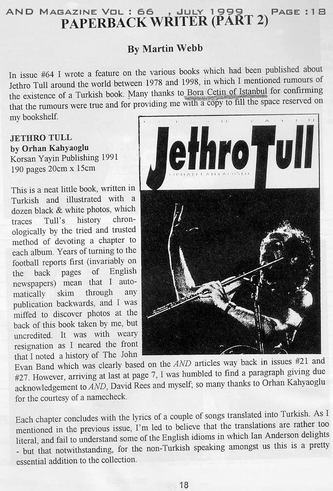 Orhan Kahyaoğlu ile dostluğumuz bir rastlantı sonucu 1993'lere dayanıyor. TULLseverliğimizi birbirimize itiraf edip 1991 kitabı üzerine konuşup birsüre görüşmedik, taa ki JETHRO TULL Magazini A.N.D.'nin Temmuz 1999 sayısında( Aşağıda var )1991 kitabının yorumu çıkana dek. Bu nedenle Orhanla tekrar haberleşip bu gurur verici olaydan haberdar etmek istemiştim.
