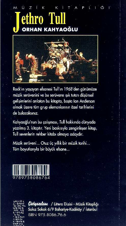Orhan Kahyaoğlu is one of the best poet, music writer in Turkey. He was a friend of mine. In 1991, Orhan's first printed Jethro Tull book is not only first printed Turkish JT book in Turkey, its THIRD printed JT Book in the WORLD ( yes, it's third Jethro Tull book in the world ! ). Orhan is a Tull fan and a poet. So he very impressed IAN ANDERSON's songwriting..... and he translated some song in Turkish ( for himself ) But, after that theres a many TULL songs in Turkish and Orhan decide to share them with Turkish music fans. In 1991 JT first visit in Turkey, first book is printed and very interested by Turkish fans. After 9 years, in 2000, TULL came in Turkey second time. In 9 years, theres a few many Tull albums and Ian Abderson solo albums. So, Orhan and I decided to renew Turkish JT Book. After the 2000 Istanbul concert, we work together with publisher Ozcan Sapan. I give new TULL and IAN albums to Orhan for listen and translate new songs. I Prepared; all B/W photos in the book ( prepare/ edit ), I prepared; front and rear book cover photos ( ı take them from the Istanbul concert ), I prepared; all Tull concert list to 2000 ( ı take some lists from puplic ), I prepared; All Tull Book's List, All TULL Members albums list, All Tull Bootlegs List and I prepared; First Time in The World ! "All TULL Web Site Adresses in the World Wide Web" List ! ..... Yes, 2000 Turkish Tull Book is a very good very satisfied JT book ( for my opinion ) ... I like it and I proud of it. It's a reference guide in the TULLIANs world. Like the first book, the 2000 book is printed just only one publishing. So, now it's a collectible item. ( The first one is more difficult to find .... ) . Thanks Orhan, Thans IAN ..... Thanks Everyone, who listened Jethro Tull.